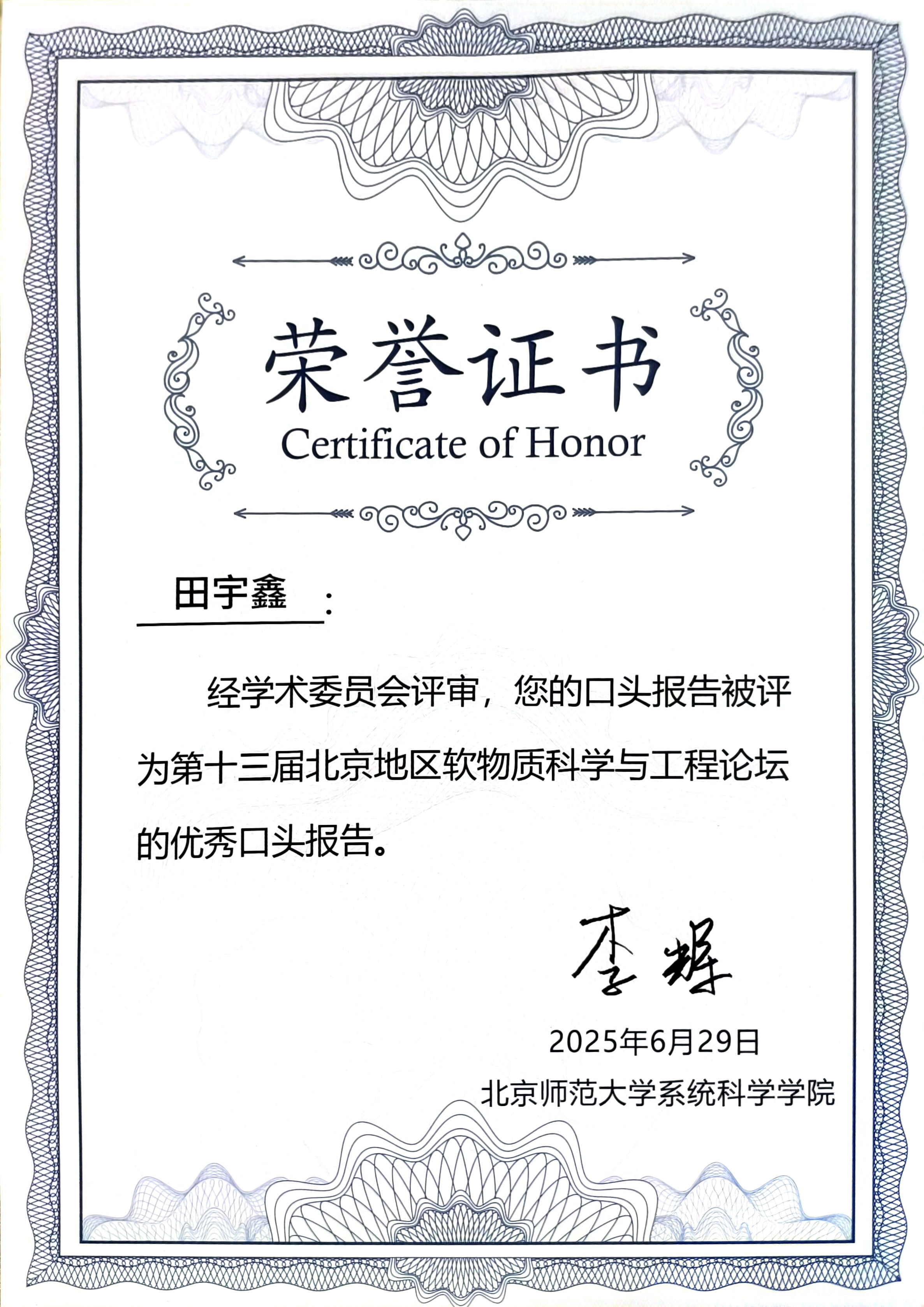 田宇鑫获第十三届北京软物质科学与工程论坛优秀口头报告奖